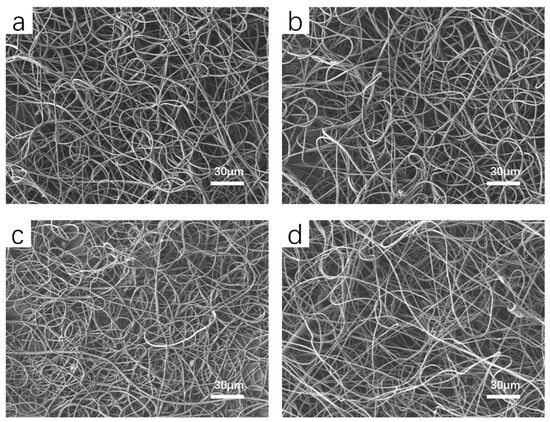 When the fiber membrane is utilized for filtration, the 3D curly fiber structure can result in reduced air resistance. However, the space support effect brought about by this 3D curly structure will also marginally decrease the filtration efficiency of the fiber membrane. It is generally considered an effective strategy to enhance filtration efficiency by imparting an electrostatic electret effect to the nanofiber filter without compromising the filter pressure drop. In line with this perspective, TiO2 NPs were introduced into the spinning solution as an electret enhancer, and PVDF nanofibers with an electret effect were prepared in a single step through electrostatic spinning. Figure 2 shows the SEM images of PVDF/TiO2 composite nanofibers with TiO2 NP contents of 0.25 wt%, 0.5 wt%, 0.75 wt%, and 1.0 wt%. In comparison with pure PVDF in Figure 1b, the introduction of 0.25 wt% and 0.5 wt% TiO2 NPs appears to have no effect on the crimp morphology, and with the addition of TiO2 NPs, the fiber diameter decreases slightly in Figure 3. This may be attributed to the incorporation of TiO2 NPs, causing the solution to carry more charges, and the fibers are drawn thinner under the action of the electric field stretching. However, if the content of nano-titanium dioxide is further increased, the curling phenomenon of the nanofibers will weaken or even disappear, and the nano-titanium dioxide particles will also agglomerate. The weakening and disappearance of the curly structure may reduce the porosity of the fiber, and the increase in agglomeration may lead to uneven charge distribution, and it even has the reunion fall off.