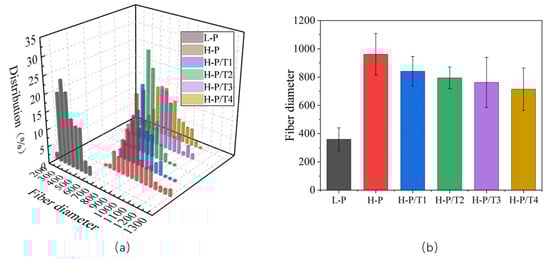 Diameter distribution and average diameter of fibers. (a) Comparison chart of fiber membrane diameter distribution. (b) Comparison chart of fiber average diameter.