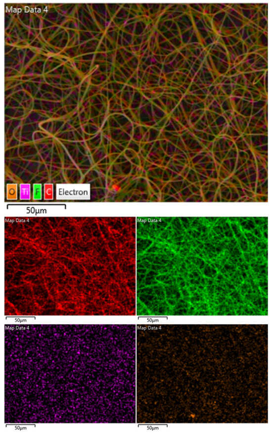 Figure 4 shows the EDS element distribution diagram of a 3D curly nanofiber composite membrane with a mass fraction of 0.5 wt% added TiO2 electret particles. The C, O, F, and Ti elements are marked in red, yellow, green, and purple, respectively. By combining Figure 4 and Table 2, it can be seen that the proportion of the C and F elements is relatively high. The fiber outline can be slightly observed through the C and F element distribution diagram. This is because the fiber-based material PVDF is dominated by C elements and F elements. The O element occupies a low proportion, and the Ti element occupies the lowest proportion. It is almost impossible to see the fiber outline from the element distribution of O and Ti, and it shows that O and Ti elements are evenly distributed on the nanofiber membrane. The electret particle TiO2 NP was successfully compounded on 3D curly nanofibers.