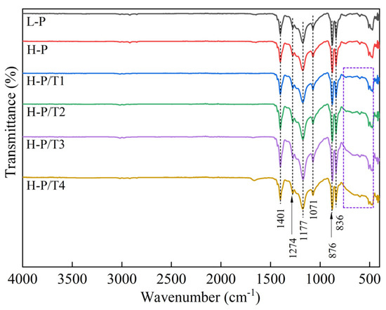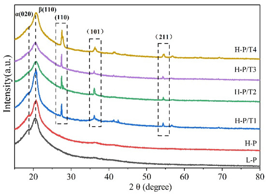 H-P/T1, H-P/T2, H-P/T3, and H-P/4 fiber membranes produced new rutile TiO2 diffraction peaks at 27.4°, 36.1°, and 54.4°, confirming that TiO2 NP was introduced into the fiber membranes [35]. As the TiO2 NP content increases, the α phase diffraction peak of PVDF gradually becomes weaker, indicating that the addition of TiO2 NPs may inhibit the generation of the α phase of PVDF.