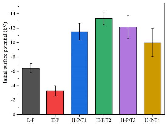 Based on the dominant dipole charge in PVDF fiber, the surface potential of the fiber membrane is negative [36]. Each sample was tested at 20 points. Figure 7 shows that the surface potential of densely packed PVDF nanofiber membrane (P-L) prepared in a low-humidity environment is about −6.42 kV.