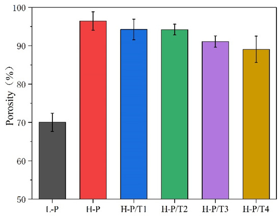 As shown in Figure 8, the porosity of a L-P fiber membrane is close to 70%. As can be seen intuitively from Figure 1 and Figure 2, a 3D curly fiber membrane has a highly fluffy structure, and this special spatial structure brings higher porosity. Compared with the tightly packed L-P fiber membrane, the porosity of a fluffy 3D curly fiber membrane is greatly improved. Due to the good supporting effect of 3D crimped fibers and electrostatic repulsion between fibers, the porosity of an H-P fiber membrane reaches about 96.93%. This result is consistent with the side-view results of L-P (densely packed membrane) and H-P (fluffy membrane) shown in Section 3.1. The gap between fibers of the 3D curled membrane is larger, which will be beneficial to the electret effect. After the introduction of titanium dioxide nanoparticles, the porosity decreased slightly, but it was still significantly higher than that of L-P fiber membrane.