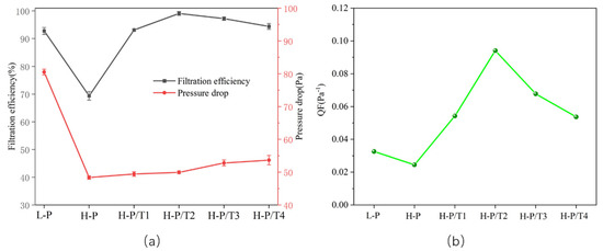 (a) Filtration efficiency and pressure drop. (b) Quality factor (QF).