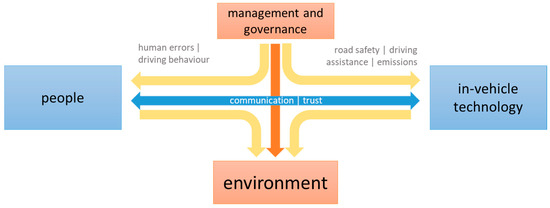 On the horizontal axis, connecting people and technology, we discussed the need to integrate safety and usability requirements. This is related to public acceptance and the maturity of the technology. In regard to AVs, several studies dealt with public acceptance [20] and the drivers’ ability to interact with automated systems [2]. The support of service approaches for the integration of governance and management in multidisciplinary approaches has been proposed in the smart city as a service concept [12] and, for public transport, in the well-known, mobility as a service concept.