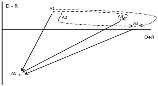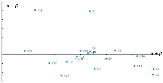 Confirm the final importance ranking using Equations (9) and (10); ( α + β ) is the horizontal axis value, while ( α β ) is the vertical axis value. These values can form a cause-and-effect diagram. This study replaces α with D and β with R.