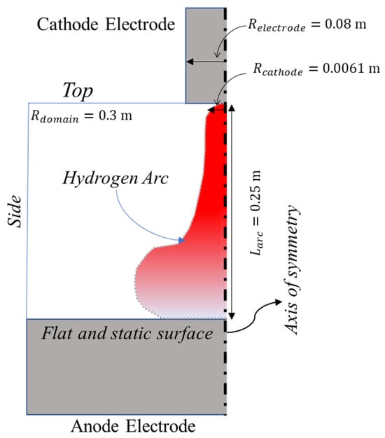 In this study, the physical model entails a 2D axisymmetric cylinder. The model resembles the micro-environment of the arc. The cylinder is filled with pure hydrogen. Figure 1 schematically shows the configuration of the model. The distance between the two electrodes, also known as the arc gap, equals 0.25 cm. The radius of the cylinder is 0.3 m. Both electrodes, the cathode and anode, are in direct contact with the base sides of the cylinder. The anode is in full contact with the bottom of the cylinder at 0.25 m. The cathode, positioned on the top, has a radius of 0.08 m. The current flowing through the arc is 5 kA for the base case. In Figure 1, an approximation of the bell-shaped arc structure is shown. The arc’s lateral boundaries are typically determined by temperatures. The current propagates when the temperature exceeds 10,000 K, at which point electrical conductivity is sufficient to maintain current flow. A total number of 280,000 structured hexahedral mesh is generated within our computational domain.