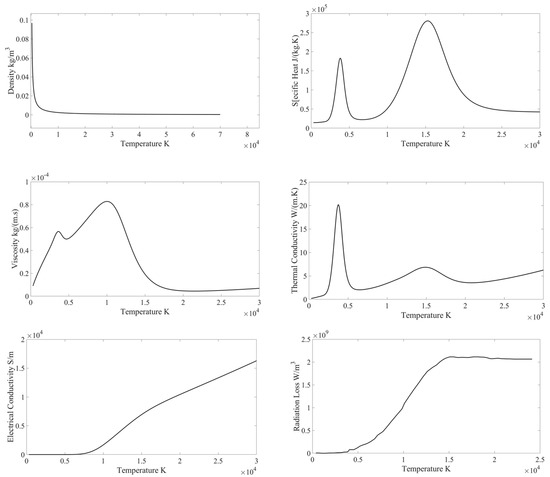 To assess the impact of compressibility on arc dynamics, we initially conducted two separate simulations. In the first simulation, a temperature-dependent density model for hydrogen (incompressible) was used. The density was purely dependent on temperature and independent of pressure. In the second simulation, the plasma was treated as an ideal gas. The state equation calculates the density for the compressible model (Equation (2)), which is influenced by temperature and pressure. Figure 2 shows the experimental measurements of the thermophysical and electrical properties of hydrogen up to 30,000 K. The experimental measurement density as a function of temperature is used for the incompressible model. All other thermophysical and electrical parameters present in Figure 2 are calculated identically in both cases. As a result, we can assess the effect of compressibility without being influenced by other factors inside the arc.