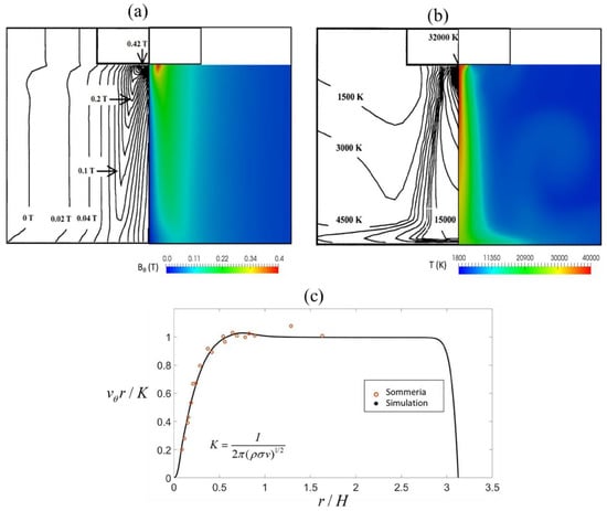 The temperature of the cathode spot is set to be constant and equal to 4000 K. The top side and bottom are considered to be thermally adiabatic. A high temperature of the cathode spot is required to sustain a high current density [31,32]. The current density at the cathode spot is assumed to be constant and equal to 4.4 × 107 A/m2 [7] for a total current of 5 kA. This gives a cathode spot size of 0.0061 m, as shown in Figure 1. Table 1 summarizes the boundary condition of the domain. The position of the cathode spot is set to be fixed in the center of the cathode electrode. No external magnetic field is present to interact with the applied current in this study.