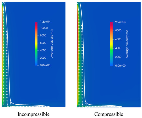 The average velocity distribution for both models (incompressible and compressible) for 10 milliseconds of physical time.