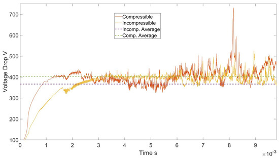 Voltage drop comparison between incompressible and compressible models over 10 milliseconds.