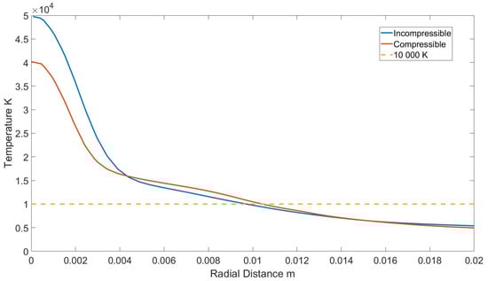 Figure 7 depicts the average temperature variation as a function of radial distance from the center of the domain. The temperatures were recorded at a depth of 0.025 cm beneath the cathode spot. Inside the incompressible model, the temperature distribution exhibits higher values at the core of the arc compared to the compressible model. However, it also shows a steeper decrease, with the arc’s temperature dropping below 10,000 K at a radial distance of 0.0092 m. Conversely, the compressible model predicts lower temperatures at the core of the arc, but the region with temperatures above 10,000 K extends further. For the compressible arc, the radius equals 0.0105 m. The lower temperature at the core of the arc, coupled with the wider arc, helps to explain the higher voltage drop observed in Figure 6 for the compressible arc.