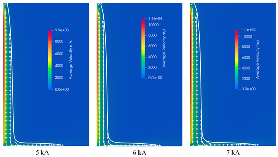The effect of applied current on the arc dynamics for compressible hydrogen plasma is analyzed in this section. Herein, results considering different applied electric currents, including 5, 6, and 7 kA, are presented. Figure 8 shows the average velocity distribution for the arc for three different current values. With the increase in current from 5 to 6 kA, the velocity increases from 9900 m/s to 11,000 m/s. However, the velocity increases slightly to reach 11,280 m/s at 7 kA. The increase in applied current leads to an increase in velocity; nevertheless, the increase is non-linear and the rate of increase tends to decrease with an increase in the applied current.