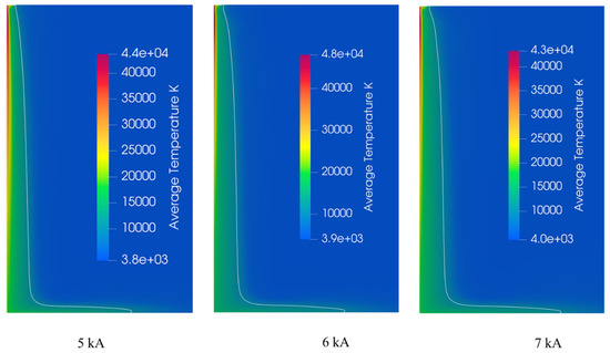 The comparison of average temperature distribution for compressible flow over 10 milliseconds is shown in Figure 9 for 5, 6, and 7 kA arcs. The maximum temperature of the arc is 44,000 K for 5 kA, while it is 48,000 K for 6 kA and decreases slightly to 43,000 K at 7 kA. Despite the increase in applied current, the maximum temperature of the arc core is almost in the same range. The temperature range is not affected significantly by the increase in applied current.