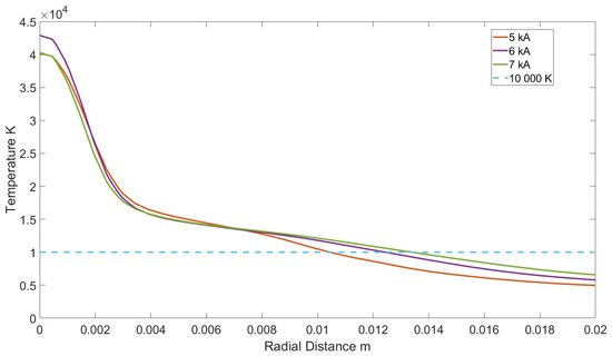Further insights can be gathered by examining the arc radius. Figure 10 illustrates the radial temperature distribution along the arc at a depth of 0.025 m beneath the cathode spot. In the case of the 5 kA arc, the core temperature reaches 44,000 K, and the temperature decreases rapidly, falling below 10,000 K at a radius of 0.0105 m. For the 6 kA arc, the core temperature rises to 48 000 K and decreases at a slower rate, dropping below 10,000 K at 0.0125 m. In the case of the 7 kA arc, the core temperature reaches 43,000 K, but the region with temperatures above 10,000 K extends to a radius of 0.0135 m. This confirms that the increase in applied current does not increase the core temperature of the arc but leads to a larger arc radius.