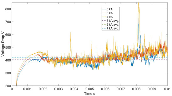 Figure 11 illustrates the voltage drop as a function of time for the compressible model. Although they exhibit different average voltage drop values, the structures of the arc voltage drop closely resemble each other. A direct correlation between the arc radius and voltage drop can be observed, indicating that the voltage drop increases with the radius of the arc. However, the increase in applied current is not proportional to the voltage drop. Specifically, the voltage drop for the 5 kA arc was 403 V, increasing to 417 V for the 6 kA arc and 421 V for the 7 kA arc. The increase in voltage drop can also be related to the increase in arc radius while having an almost constant core temperature inside the arc.