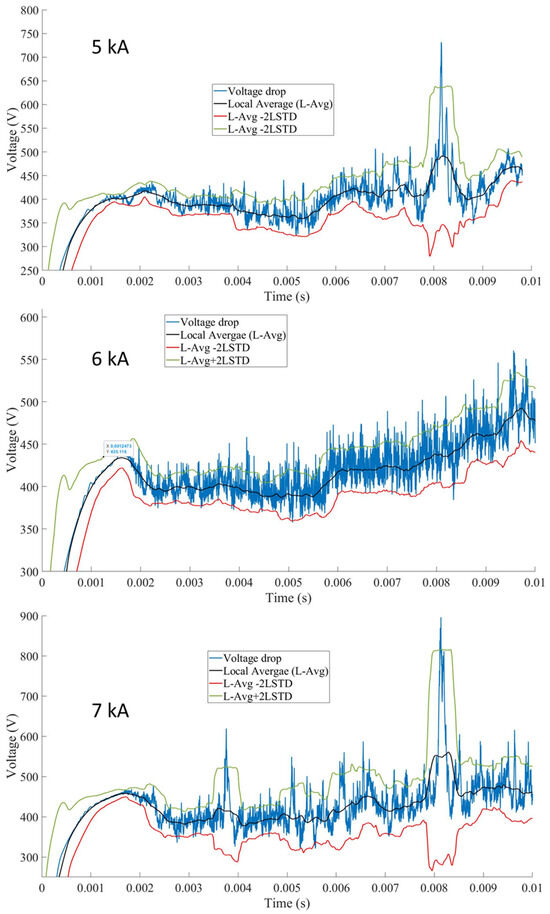 Figure 12 illustrates plots for voltage, local average, and the L-avg ± 2 LSTD for each applied current. Analyzing the 5 kA arc voltage drop shows a few random extreme events, estimated at less than 30 events, occurring sporadically. However, for 6 kA, the frequency of extreme events significantly increases, persisting throughout the simulation. At the highest current of 7 kA, the amplitude of extreme events experiences a steep rise, with voltages peaking at 870 V. Despite fewer frequent extreme events compared to 6 kA, the duration and amplitude of these events increase. From the analysis of the voltage behavior, the increase in applied current leads to an increase in extreme events and voltage variation.