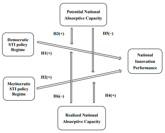To investigate these research questions, this study first proposes the concept of dual STI policy regimes, and hypothesizes that both a democratic policy regime and a meritocratic policy regime act as positive contributors to national innovation performance. Second, this study introduces the concept of national absorptive capacity (NAC) as a key moderating factor of the national innovation function, and hypothesizes that potential NAC (PNAC) and realized NAC (RNAC) moderate, in opposite directions, how a democratic policy regime and a meritocratic policy regime affect national innovation performance.