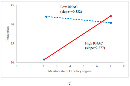 A country’s high RNAC brings the advantage of concentrated investments in exploitative activities and applied technology. As this concentration reaches a specific threshold, accelerated knowledge accumulation and a sharpened learning curve work together to bring about a sharp rise in both knowledge search scope and depth in exploitation. That triggers a great leap forward in product quality and process improvement, and eventually an eruptive growth in product and process innovation. Hence, RNAC acts as a moderator in a converting meritocratic policy regime into more innovation output in application and commercialization.