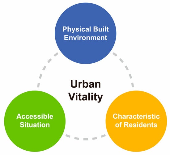 - Liu, H.; Gou, P.; Xiong, J. Vital Triangle: A New Concept to Evaluate Urban Vitality. Comput. Environ. Urban Syst. 2022, 98, 101886. [Google Scholar] [CrossRef]