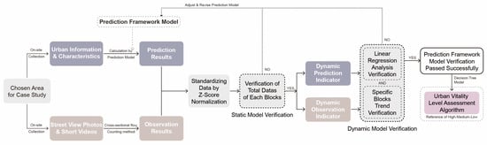 The process of verification through a case study involves several steps (Figure 3). Initially, an urban zone is selected and divided into small blocks. The new dynamic model is then utilized to predict the results for each period of these blocks on weekdays and weekends. Subsequently, suitable dates are selected to gather street view data (short video and photo) for the selected blocks, and cross-sectional flow counting of spatial vitality [25] for each period on the sampled dates. The two sets of predicted and observed data are then processed into comparable indicators [24,26]. Finally, the reliability of the algorithm prediction model can be verified by evaluating and comparing these two sets of data.