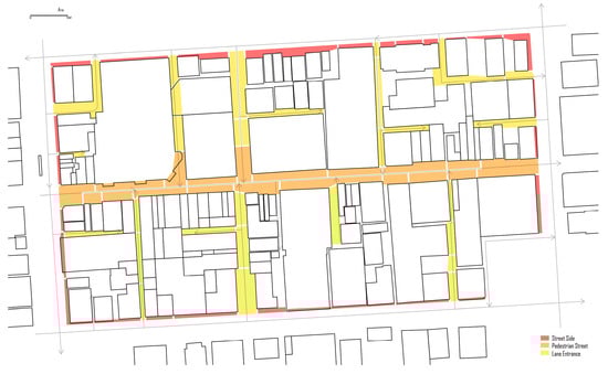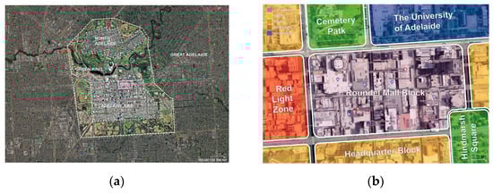 Adelaide, the capital of South Australia, stands as the fourth largest city in Australia and has earned the title of “the most livable city in Australia” numerous times [29]. The central urban area of Adelaide encompasses Adelaide CBD, Green Ring, and North Adelaide. Rundle Mall Block, situated in the northeast of Adelaide CBD, serves as a quintessential example of an Australian urban block (Figure 4a). Rundle Mall finds itself adjacent to Adelaide University to the north, the headquarters business block to the south, a red-light district to the west, and Hindmarsh Square to the southeast, solidifying its status as one of South Australia’s most beloved destinations (Figure 4b). Rundle Mall spans approximately 255,300 square meters and primarily functions as a hub for commercial retail, dining, and small-scale offices.