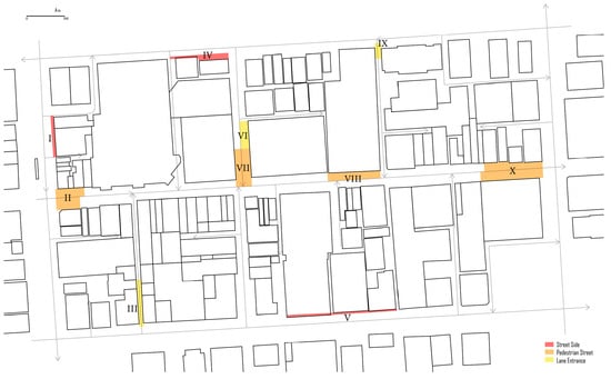 The public urban space within the Rundle Mall Block was subdivided into 98 small blocks (Figure 5), delineated by both physical environmental boundaries and the functional characteristics of adjacent buildings. To enhance verification efficiency and reduce the costs associated with field data collection, this study meticulously assessed spatial attributes and distribution locations. Consequently, 10 blocks, as depicted in Figure 6 and Table 6, were selected for on-site data collection.