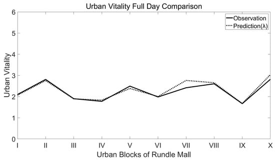 Next, the data variation for specific blocks is verified. This step aims to confirm that the data aligns with common science and prevents the linear regression calculation from being based on erroneous results. The following Table 9 presents the comparison between the dynamic model’s predictions and on-site observations for three types of blocks. Each type of block shows an example, with weekdays on the left and weekends on the right. In Table 9, solid lines represent the observed value indicators obtained from on-site data collection, while dashed lines represent the predicted value (λ) indicators calculated based on the dynamic algorithm. The results illustrate the fluctuations in urban vitality levels for each of the three block types during weekdays and weekends from 8:00 to 20:00, in two-hour intervals. The trends align well, accurately corresponding to peaks and troughs. In the overall urban vitality ranking, the Pedestrian Street displays first, followed by the Street Side, while the Lane exhibits the last. Additionally, there is a noticeable increase in vitality starting from noon in each day and block. These findings are aligned with common knowledge [n]. The validation of the dynamic model for specific blocks has also been successful.