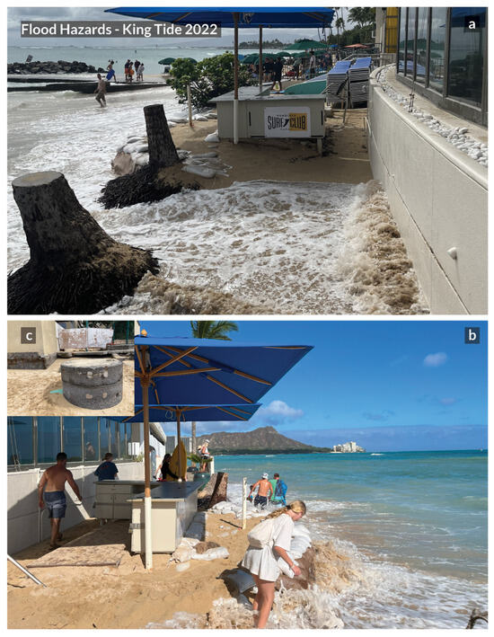 Waikīkī is a 3.89 km2 (1.5 mi2) intensely developed commercial, residential, resort beachfront urban area in Honolulu, HI [1]. This economic hub is a popular recreational and cultural destination for tourists and locals and contributes to approximately 42% of the state’s visitor industry revenue and $5 billion of the Gross State Product [2]. Waikīkī is located in a low-lying area, and challenges of flooding include sea level rise-induced direct marine inundation, storm-drain backflow, and groundwater inundation (GWI) [3,4], compounded by high-wave runup, extreme tides, heavy rainfall, and a shallow groundwater table [4,5]. Figure 1a–c shows high wave run-up and a king tide washing over the beach and impacting existing structures. Consistent investment in the beachfront includes beach nourishment [6], groin repair/replacement to address present-day erosion [2], and future flooding from sea level rise.