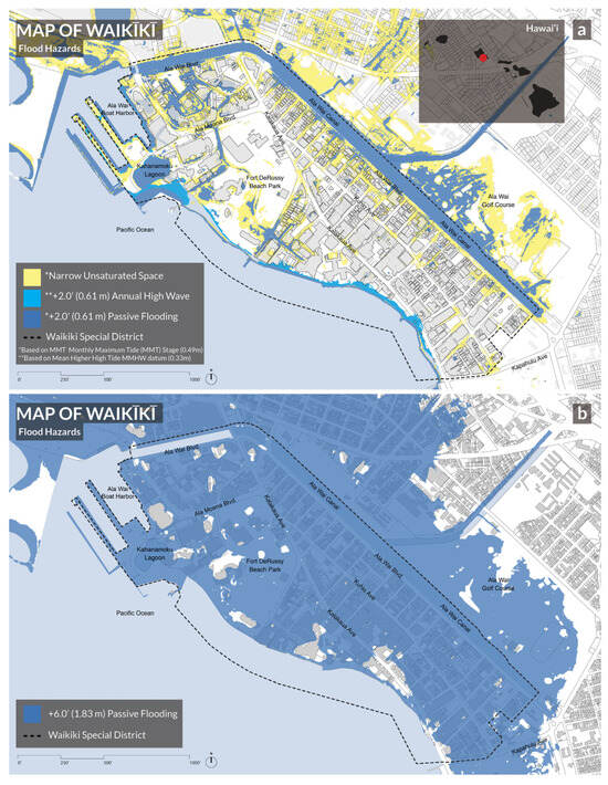 Flood hazards in Waikīkī District at (a) 0.61 m (2.0′) and (b) 1.83 m (6.0′) of SLR [3,38,39]. Image credit: Josephine Briones.