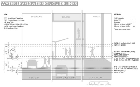 During the course of this research, however, the revised “Sea Level Rise II—Guidance Document,” the CCH Climate Change Commission recommends using at a minimum “[t]he Intermediate or higher level sea level rise scenario as a benchmark, adding 0.30 m (1′) of freeboard to accommodate a King Tide, and adding an additional 0.30 m (1′) of freeboard to accommodate heavy rainfall at high tide when there is no drainage capacity in the coastal zone, would provide an even greater buffer against flood damage” [33]. This recommendation improves flood prevention and acknowledges the reality of multi-mechanism flooding.