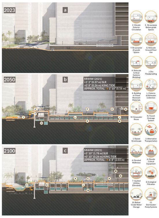 Building and street: (a) present conditions, (b) 2050 Adaptations, (c) 2100 Adaptations. Letters and numbers on the renderings correspond to the icons of adaptation strategies. Image credit: Eric Teeples.