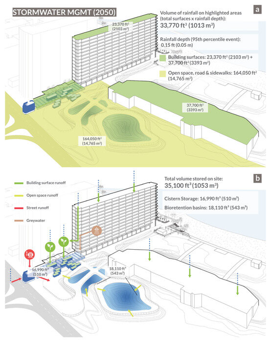 (a) Diagram of surfaces included in hydrology calculation and (b) diagram of water storage capacity on-site, including potential building greywater reuse. Image credit: Georgina Casey and Josephine Briones.