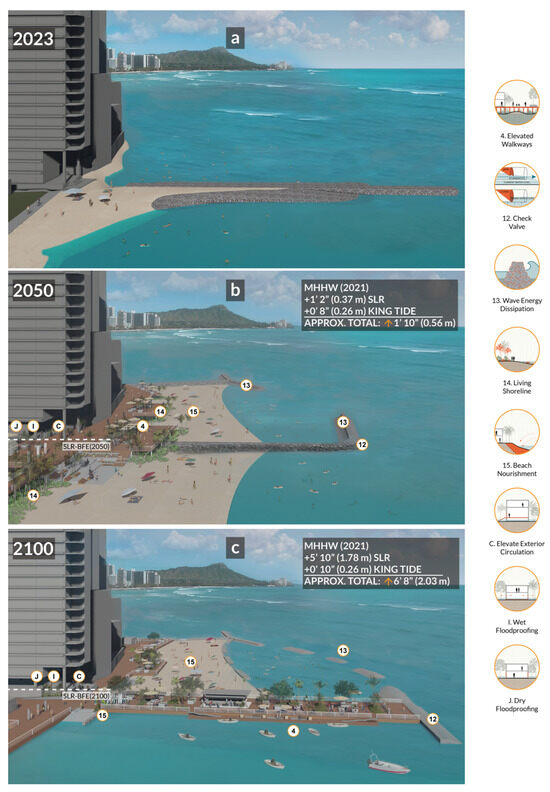 The present conditions at the coastal area include a small stretch of beach, a man-made groin perpendicular to the shoreline, and access to the building’s first floor, where a lanai (or veranda) of retail, food, and recreational, commercial spaces connect to the sand via stairs and ramps (Figure 7a). The area experiences limited beach access due to erosion, requiring beach nourishment to maintain access [6]. At-grade walkways along the beach are flooded by seawater at high tide and king tide events, preventing beach access and posing hazards to the public. Existing buildings and infrastructure show signs of corrosion from saltwater exposure from high wave run-up. In 2050, without adaptation, a combined 0.56 m (1′ 10″) SLR and king tide would increase the severity of coastal erosion and limit public access to the shoreline. In 2100, without adaptation, a combined 2.03 m (6′ 8″) SLR and king tide would inundate the entire beach, and the commercial spaces would flood. To address SLR impacts for this area, adaptation strategies are proposed to preserve public accessibility to the beachfront and improve the building’s resilience to flooding for continued operation.