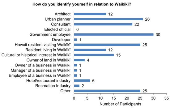 The 2023 public presentation of adaptation strategies gathered 220 diverse participants, nearly double the number of participants in the project’s 2022 public presentation. Anonymous feedback was collected from more than half the number of participants on a total of 39 polls using the integrated online survey tool Mentimeter [50]. The first poll asked: How do you identify yourself in relation to Waikīkī? Participants’ interests and backgrounds ranged from landowners, government employees, hotel owners, urban planners, architects, residents, and design professionals, see Figure 8. A significant number of individuals’ backgrounds and interests were in government and urban planning.