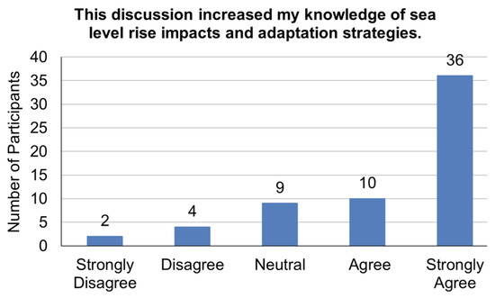 The visualizations of adaptation strategies integrated at a specific site enhanced participants’ questions and comments since they could use them as references when posing their thoughts. Discussion held within the Zoom [49] chat function and panel Section 4 of the presentation covered themes on policy, planning, financial, sequencing, water level datums (BFE/DFE), infrastructure (coastal infrastructure), structural, tourism, public transportation, cultural, and stormwater management. Participants recognized the complexity of implementation when dealing with multiple landowners with varying levels of responsibility, liability, and financial incentive. One challenge of polling on adaptation strategies was retaining engagement throughout the presentation, peaking at 119 respondents early in the presentation and slowly decreasing to 85 as it went on. Based on the exit poll, overall, 75% of participants strongly agreed or agreed that the discussion increased their knowledge of sea level rise impacts and adaptation strategies (Figure 9).