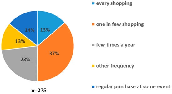 Dependent variable: self-reported actual purchase of organic foods based on environmental consciousness. We created our dependent variable based on the information about future purchasing frequencies of organic foods based on environmental consciousness. Figure 1 shows that 13% of the respondents would purchase organic food based on environmental consciousness during every shopping trip, 37% would purchase organic food every few shopping trips, 23% would purchase organic food a few times a year, 13% would purchase organic food at a frequency other than those listed above, and 14% of them would not purchase organic food during general grocery shopping but would purchase organic food during an event (regular purchase at some events).