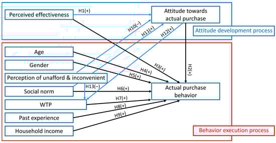 Additionally, ref. [12] argued that environmental perception is not enough to execute consumers’ environmentally conscious behavior. Consumers’ psychological driving factors are two-fold—the attitude development process and the execution of environmentally conscious behavior (actual behavior)—and the actual behavior can be observed when the behavior execution process exceeds the attitude development process.
