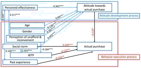 Estimated standardized path coefficients for the revised model. Note: *, **, *** indicates a p-value less than 0.1, 0.05, 0.001, respectively, and all variables are observed, so rectangles are used to represent the variables. Black solid lines indicate a direct effect on actual purchase, blue lines indicate an indirect effect on actual purchase, and blue dotted lines indicate an effect on attitude towards actual purchase. Numbers (path coefficients) indicate the degree of relationship; n = 275.