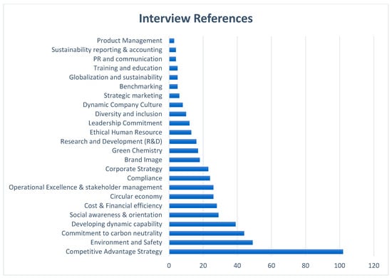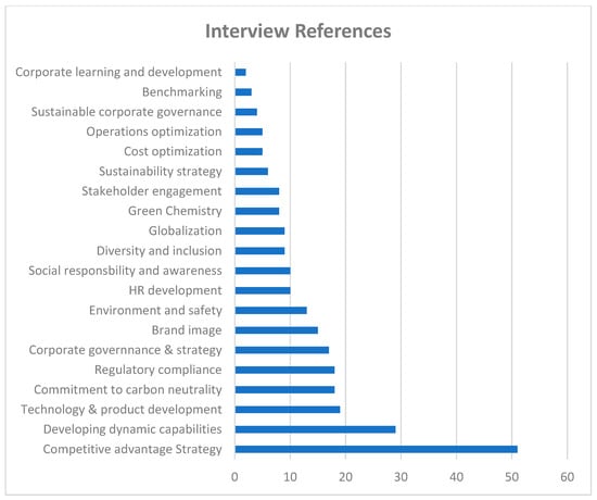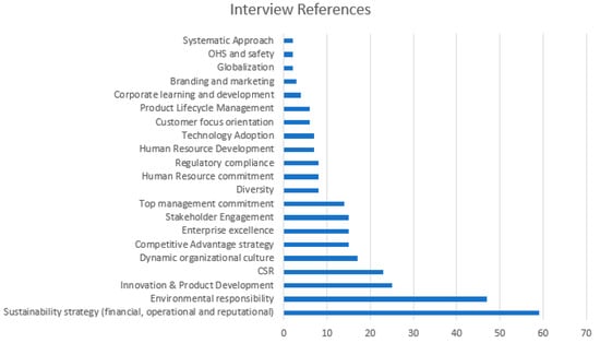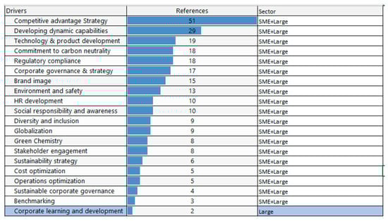All 20 drivers were arranged as per the number of references received from the experts during the interviews. Drivers with more references were deemed more important in terms of receiving the attention from businesses in Pakistan. This does not mean that the drivers with a lower number of references were considered of lower importance in terms of enabling organisations to achieve sustainability. It could simply mean that the drivers with fewer references are relatively new practices being adopted by businesses and, hence, they might have not yet become a widespread practice in Pakistan. The list of drivers as per references received is graphically represented in Figure 6.