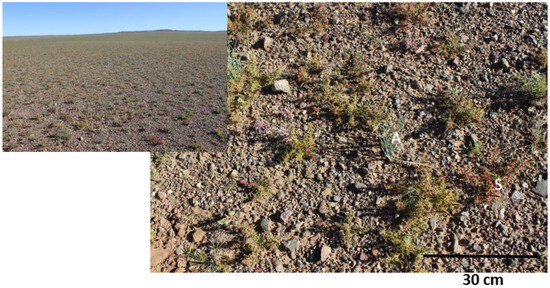 Gobi landscape and Vegetation (Table 4, similar to Area III but without coal dust in surface material). Gobi vegetation: S = Salsola sp. A = Allium sp.