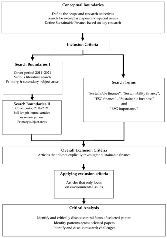 This systematic review consists of research on sustainable finance and ESG criteria. It draws on scholarly work from across the fields of business, management, economics, and finance. After determining the key variables and setting the boundaries of sustainable finance and ESG criteria, we built on reviews by Munoz and Cohen [], Doherty et al. [], Ansari and Kant [], and Webster and Watson []. The research database Scopus was chosen for this study, and a list of predefined keywords was applied. The search was delimited to studies published between 2011 and 2021. The stepwise process is presented in Figure 1. Our initial research aimed at gathering studies from primary and secondary subject areas and, thus, included the following keywords: “sustainable” and “finance” OR “sustainability” and “finance” OR “finance” and “ESG”. Following the review by Munoz and Cohen [], the key terms were separated at first, because the researchers may have used them without combining them into a pair-word form. The primary search generated 7646 documents, which provided the opportunity to look at articles from a wide range of fields (e.g., management, social sciences, environmental science, energy, engineering, and decision sciences).