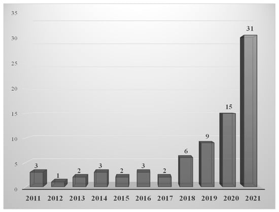 In the final stage, we manually selected studies that explicitly investigated sustainable finance, and only 77 were deemed relevant. Table 1 presents the number of sustainable finance studies published by journals during the period 2011–2021. The growing recognition of the subject is depicted in Figure 2. More specifically, between 2011 and 2017, the number of publications ranged from one to three per year, reaching 31 in 2021. Furthermore, it has to be mentioned that in the early period of the decade under investigation, the research was broader, and as we move into the late period, the articles investigate more specific factors of ESG. In addition, the research interest increases. In terms of the methodologies adopted in the reviewed studies (Table 2), the majority was divided equally between qualitative and quantitative (from approximately 35%), followed by smaller percentages of purely theoretical (16.9%) and mixed methods (13%). The subject areas of the journals (Table 3) included in the research mainly cover (as expected because of the subject matter and the set criteria) the fields of business, management, and accounting (41.6%) and economics, econometrics, and finance (35.1%). Table 4 details the top 10 cited topics based on the keywords.