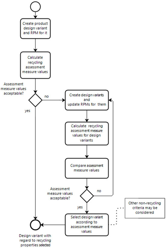 The use of the RPM in the design process of a product assumes an iterative approach to the final version of the product design through the creation of design variants and assessment of their quantitative recycling properties. This design process is presented in Figure 3. Thus, the RPM shows the influence of decisions concerning the product design made at the design phase of the product’s life cycle on recycling (as an activity that can be conducted at the last phase of the product’s life cycle). The use of the RPM within a product’s life cycle is presented in Figure 4.