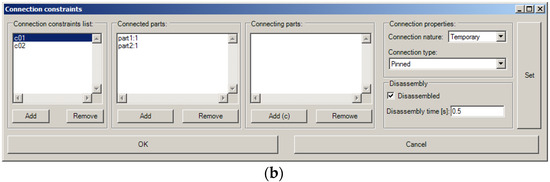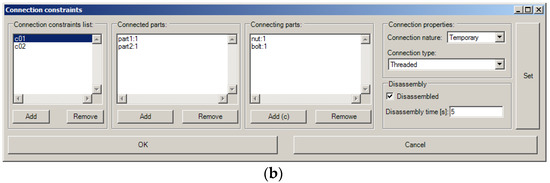 The theoretical model of a connection constraint [40] is based on a weighted hypergraph [41]. A hypergraph is the graph where the edge (called a hyperedge) joins any number of vertices [41]. In the theoretical model, vertices of the hypergraph represent connected parts, hyperedges represent connections, and connection attributes are represented by the hyperedges’ weights. The use of a hypergraph allows for a simple approach to a situation in which more than two elements of the model are connected. A connections model based on a hypergraph allows for easy implementation using data structures in a computer program.
