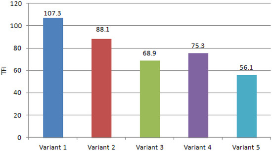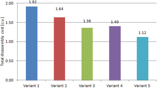 Another measure defined by de Aguiar et al. [38]—the Type of Fastener Index (TFI)—is the number between 1 and 4 that represents the ease of executing the disassembly of the evaluated fastener. A lower TFI value represents fasteners that are easier to disassemble; a higher TFI value reflects fasteners that are more difficult to disassemble. The sum of the TFI (Total TFI) for all the fasteners represents the overall difficulty of the disassembly of the whole product. The TFI values were evaluated by de Aguiar et al. [38] during an experiment that evaluated distinct types of fasteners from the points of view of disassembly time, disassembly force, types of tools needed for disassembly and viability of part reuse after disassembly. The final TFI values obtained this way were reported by de Aguiar et al. [38] in the form of a table.