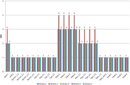There is no definition of the QFI in the paper by de Aguiar et al. [38], but from the content of the article, it stems that it equals the overall number of fasteners that connect each part (this definition of the Quantity of Fasteners Index (QFI) is the conclusion of the author). The Percentage of Fasteners Index (%FI) is defined as follows [38]: