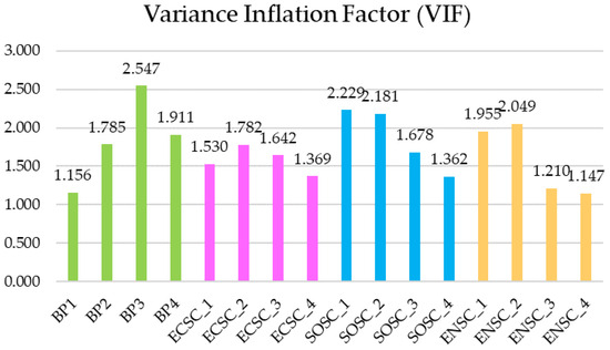 According to [91], the size of the variance inflation factor (VIF) should be in the range of 0.250–4.000. The highest VIF measure was obtained by BP_3 (2.547) and the lowest by ENSC_4 (1.147) (See Figure 3). Considering both the VIF magnitudes and the R-square value (0.435) obtained, we can state that there is multicollinearity in the structural model. Goodness-of-Fit (GoF) ranges towards 1 (0.501), which indicates a good fit between the collected sample data and the predicted data, showing a good validity or good fit of the reflective model [92].