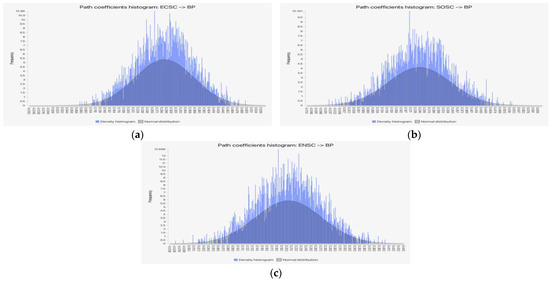All histograms in Figure 4 show differences in the dispersion of the estimated values between the paths of the exogenous variables ECSC, SOSC, ENSC, and the endogenous variable BP. Histograms (a) and (c) reveal that the ECSC → BP and ENSC → BP iterations have a more complex distribution of path loading coefficients, in contrast to (b).
