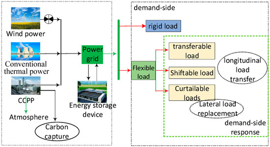 The scenario constructed in this paper, encompassing a carbon capture system, energy storage devices, and integrated demand response, is illustrated in Figure 1.