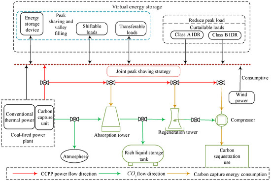 The joint peak shaving mechanism of virtual energy storage and CCPP is shown in Figure 2, which fully considers the adjustable characteristics of virtual energy storage to achieve elastic adjustments of the demand-side response, as well as the complementary characteristics of carbon capture power plants.